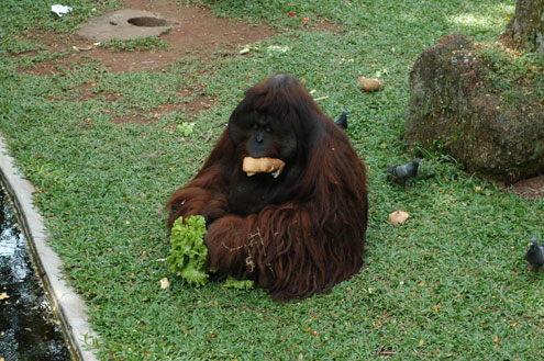 Male orangutan at the Colombo Zoo. There are signs everywhere telling visitors NOT to feed the animals, but as you can see from the lettuce and bread, these signs are ignored! |