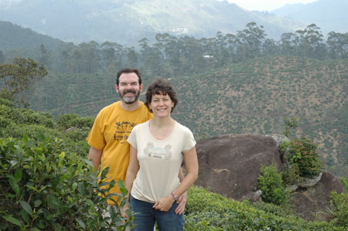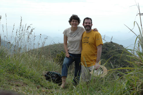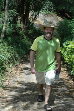 Above: Gordon hikes up the mountain to Mountain Heavens. Gordon in an unappreciated cameo shot as he prepares to brush his teeth (geez, nobody appreciates my talents. It's my latest and most daring work: Man With Colgate). Finally, Gordon and Natalie up on Little Adam's Peak, on Natalie's BIRTHDAY!!!!! BIRTHDAY BIRTHDAY BIRTHDAY!!!!! Those are tea plantations behind us. |