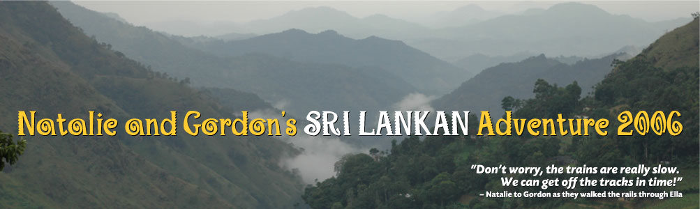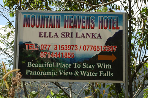 Going to Ella? We have two words for you: STAY HERE!! The Mountain Heavens Hotel was fabulous. It is a newly-constructed guesthouse that currently has four lovely rooms with ensuite bathrooms. The food was great, the view was spectacular, and the service was first-class. Shanta, who seemed never to get a day off, was incredible, and apparently did everything around the place, from serving our meals to looking after the accounts to clipping the lawns by hand with garden shears. He treats all the guests like royalty and is a credit to his employer! Just an amazingly helpful, friendly, polite person who kept us happy the whole time we were at Mountain Heavens. I don't think we could have gotten better service at any five-star hotel. And the graphic designer in me would like to point out that they got someone with a clue to design this sign. One of the better pieces of graphic art in Sri Lanka (not saying a lot, I know!) I love Sri Lanka, but there is some painfully hideous graphic design going on there! And yes, I know this website is not perfectly formatted, but I have 1,150 photos to go through and other real work to do, so I refuse to spend my time making every photo and text boxes on these pages absolutely perfect. So there! Just go to Sri Lanka, and stop worrying about my kerning.