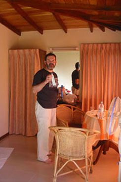 Gordon reads on the grassy terrace outside our room. We ate our breakfast here every morning. FANTASTIC! Now I'm back to dribbling cereal on my computer keyboard. |