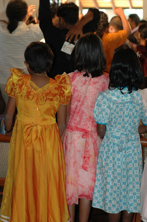 Little girls watching the dancing at the wedding reception we attended. The bride was beautiful, but did I get her photo? Noooo! I was too busy cramming my gullet with tasty little spicy shrimp snacks, French fries, and ooooo, that wedding buffet! Mercy! |