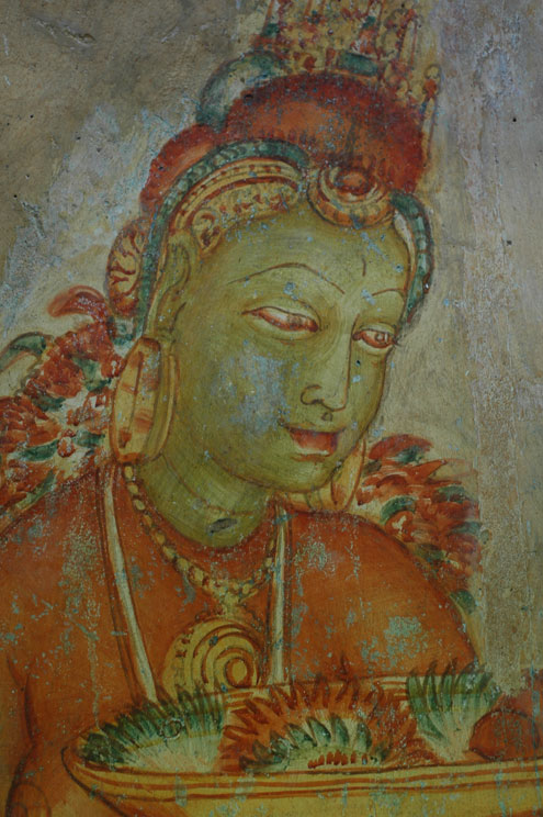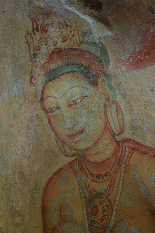 A Sigiriya Damsel. These frescoes cover a section of rock face to the right of the Mirror Wall. They're in a sort of shallow cave, and flash photography is not allowed. These girlies were painted in the fifth century, and according to Rough Guide to Sri Lanka, they are "the only non-religious paintings to have survived from ancient Sri Lanka."