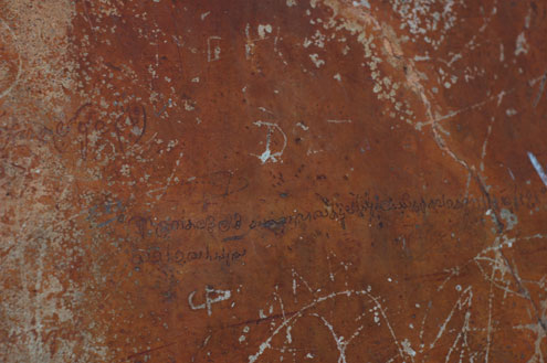 The Mirror Wall up close, with a piece of extremely old graffiti. The wall is covered in graffiti dating back all the way to the 7th century. Much of the writing records visitors' thoughts on Sigiriya and particularly the Sigiriya Damsels, pictured below. I wish I could read Sinhalese script, so that I could decipher some of the older comments and poetry!
