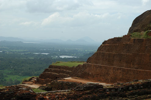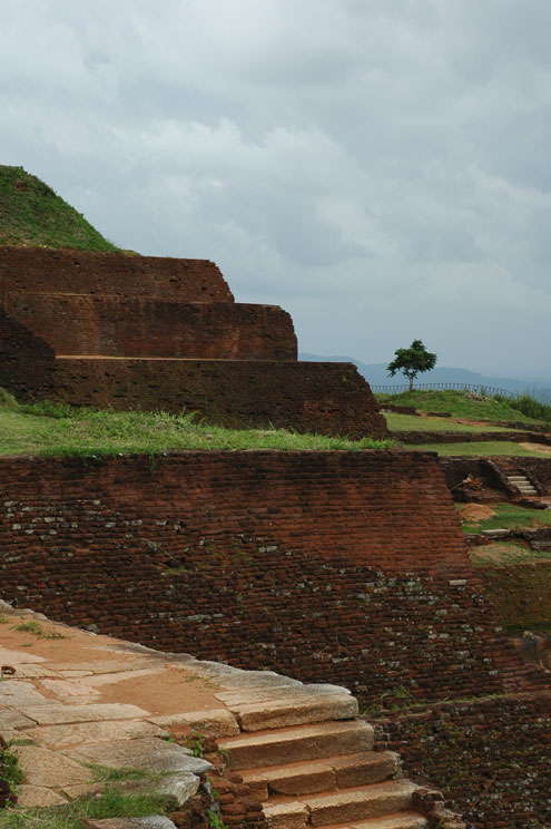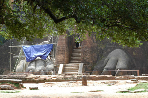 The base of the Lion Platform, which is undergoing some work. This area is just below the summit; the staircase from it is featured in the previous photo. There used to be an enormous lion statue here, but unfortunately the head fell off a long time ago, and only the paws remain. Lions are an important symbol in Sri Lanka, and indeed, a lion is featured on the national flag. |