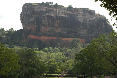 Sigiriya Rock. The reddish band across the centre is called the Mirror Wall, a section of polished plaster made from, according to the Rough Guide to Sri Lanka "lime, egg white, beeswax and wild honey."