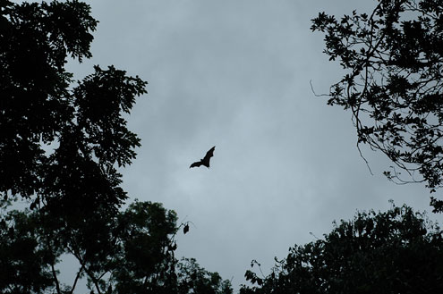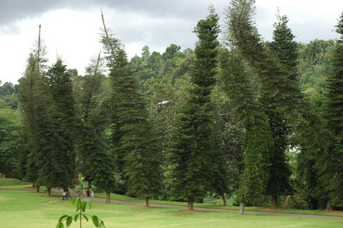 Cook's Pine Avenue. I read somewhere on the web that the trees are curved due to termites nibbling the roots, but I can't say for certain that that is true! | A very large fruit bat. There are more in the trees, but it was overcast at the time and I was having difficulty photographing them. It would probably help if I read the instruction book for our Nikon and learned to use all the settings properly! |