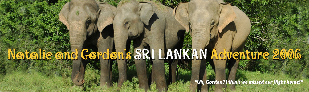 On January 19, 2006 (which happened to be Gordon’s birthday), my husband and I boarded a Singapore Airlines jet and set off for three weeks of fun in the “Teardrop of India”: beautiful SRI LANKA! Herein you will find photos and memories from our wonderful trip, a few tips and recommendations, and tales of our encounters with amazing wildlife and the equally amazing Sri Lankan people, whose smiles lit up our journey. I drank more tea than you can possibly imagine, while Gordon guzzled Sri Lankan-size beers and we both ate vast quantities of yummy curry and tropical fruit. We can’t recommend this jewel of a country enough as a travel destination, and they need all the tourists they can get there after the devastating tsunami of 2004. Visit Sri Lanka, and Ayubowan: may you live long!